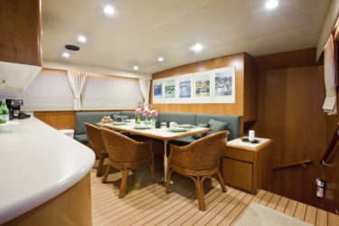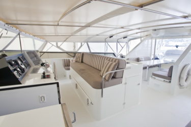 With multiple seating areas, inclusive of a covered flybridge with ample seating area and table. There is an additional covered seating area with a table off the stern to enjoy the fresh sea air and gorgeous views.